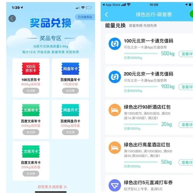 用户刷绑定后的北京一卡通,乘坐公交、地铁将在2天后自动生成碳能量球,可在7天内领取,碳能量可在高德地图、百度地图APP中兑换北京一卡通充值码或爱奇艺会员、百度网盘会员等优惠,也可用于植树、修桥等公益项目。