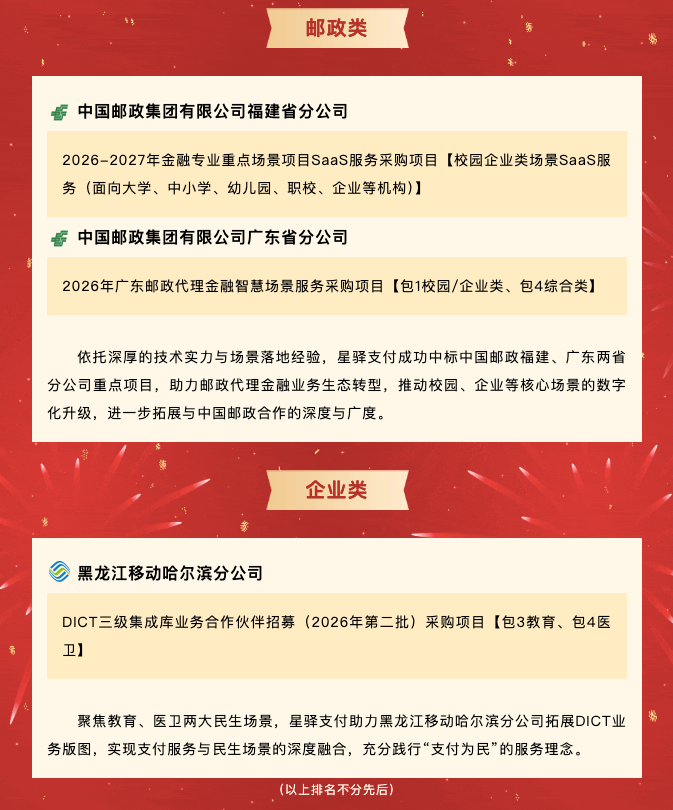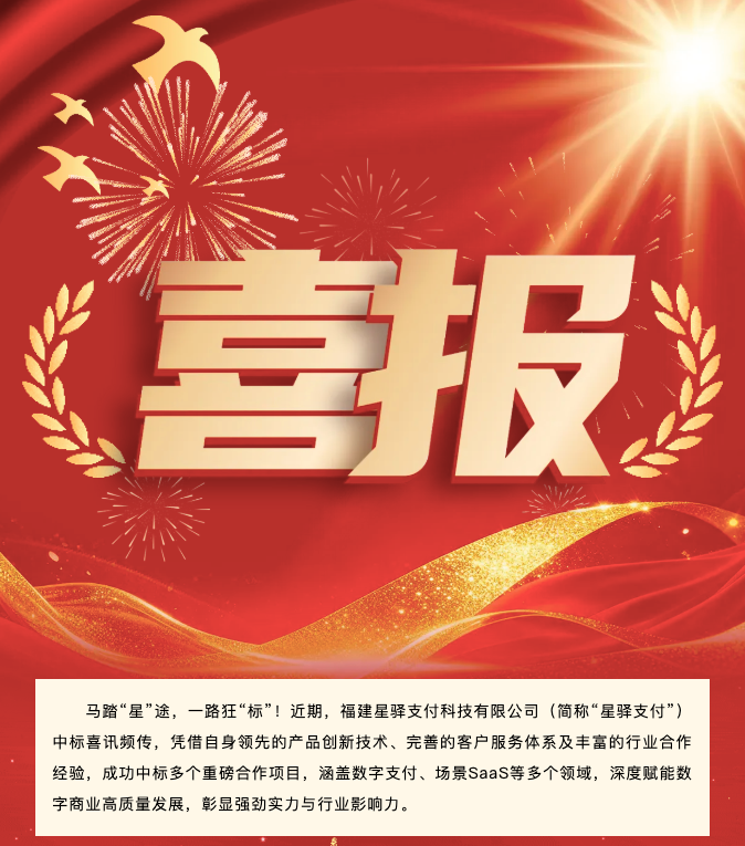 马踏“星”途,一路狂“标”!近期,福建星驿支付科技有限公司(简称“星驿支付”)中标喜讯频传,凭借自身领先的产品创新技术、完善的客户服务体系及丰富的行业合作经验,成功中标多个重磅合作项目,涵盖数字支付、场景SaaS等多个领域,深度赋能数字商业高质量发展,彰显强劲实力与行业影响力。