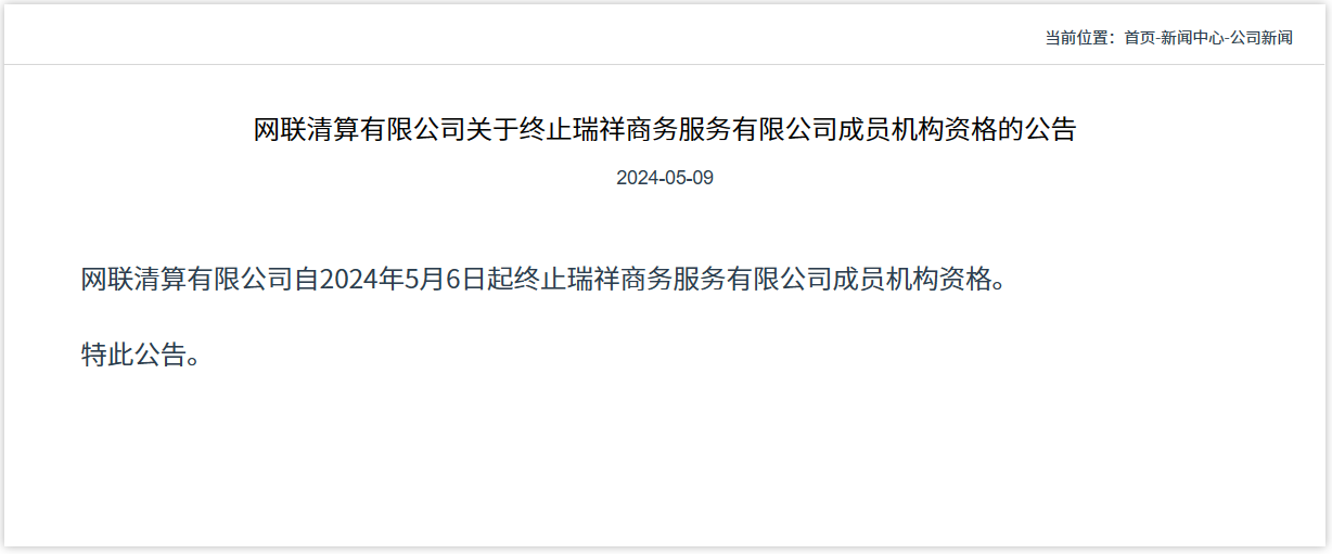 网联清算有限公司日前发布关于终止瑞祥商务服务有限公司(简称“瑞祥商务”)成员机构资格的公告,表示自2024年5月6日起终止该公司成员机构资格。